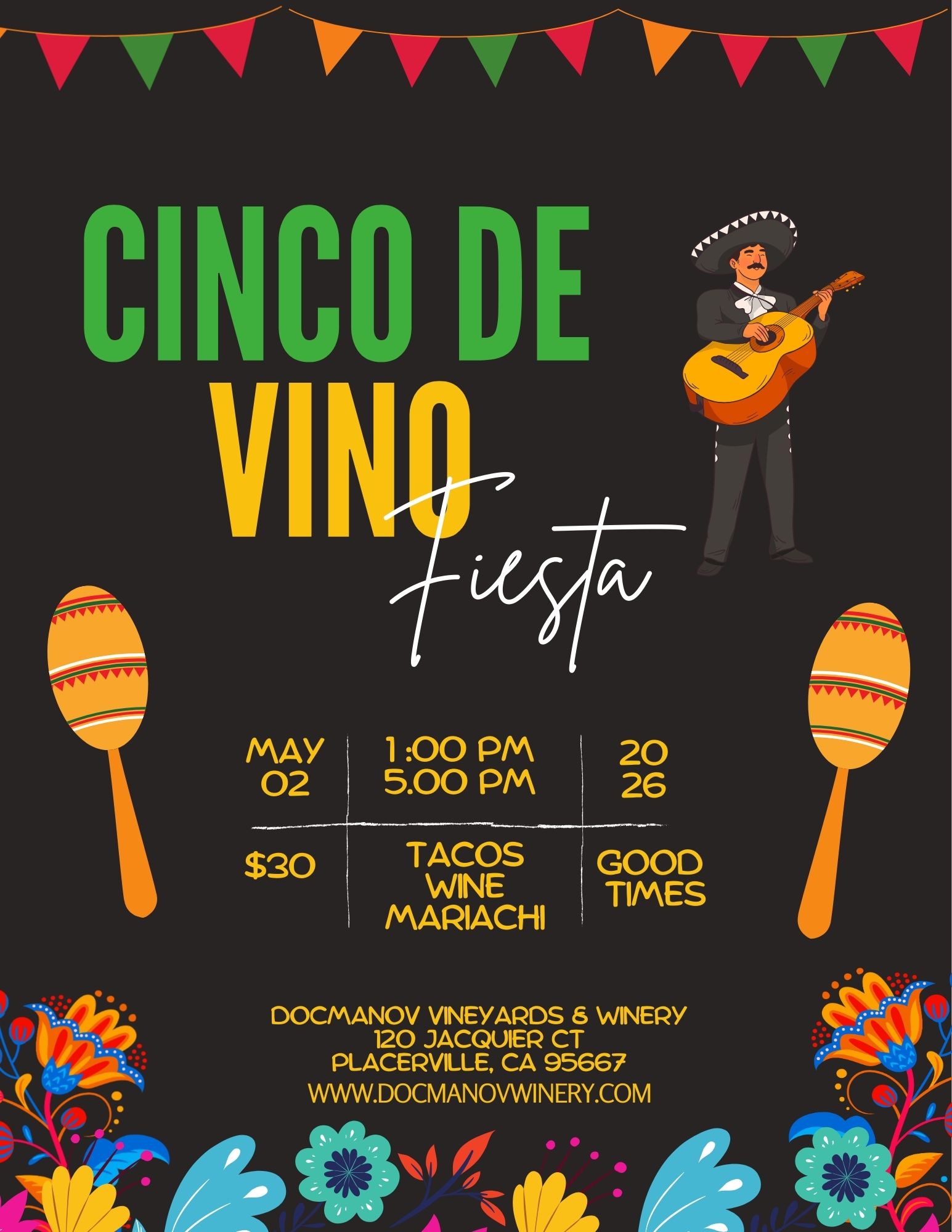 Docmanov Vineyards & Winery 120 Jacquier Ct, Placerville, CA, United StatesJoin us for "Cinco de Vino Fiesta" — an afternoon of lively music, delicious food, and great company among the vines. When: Saturday, May 2, 2026 | 1:00 PM –